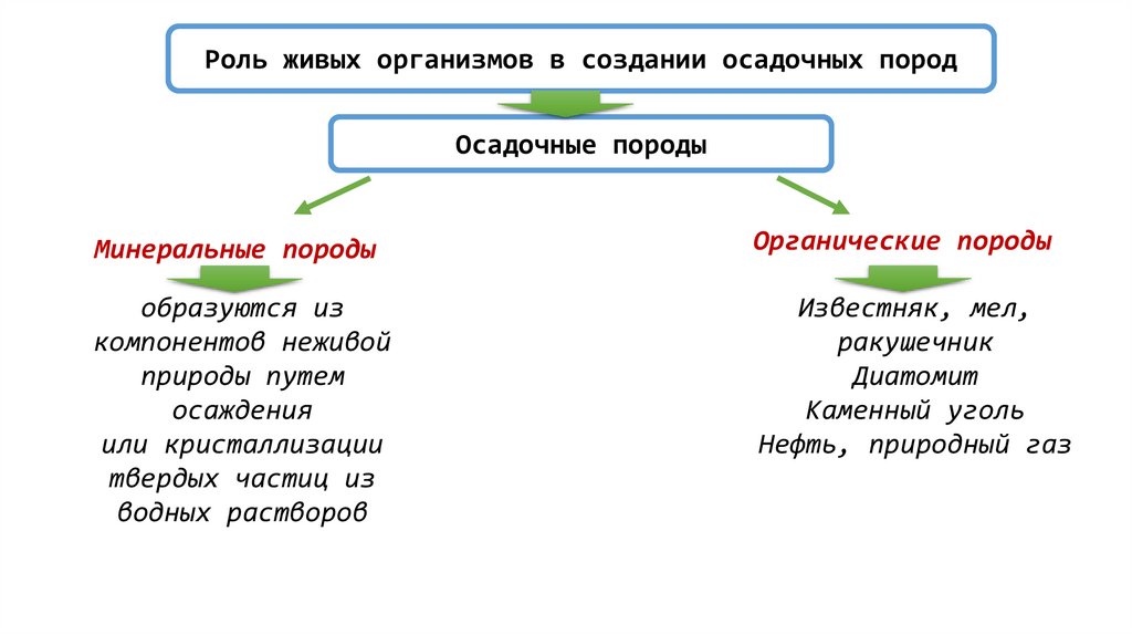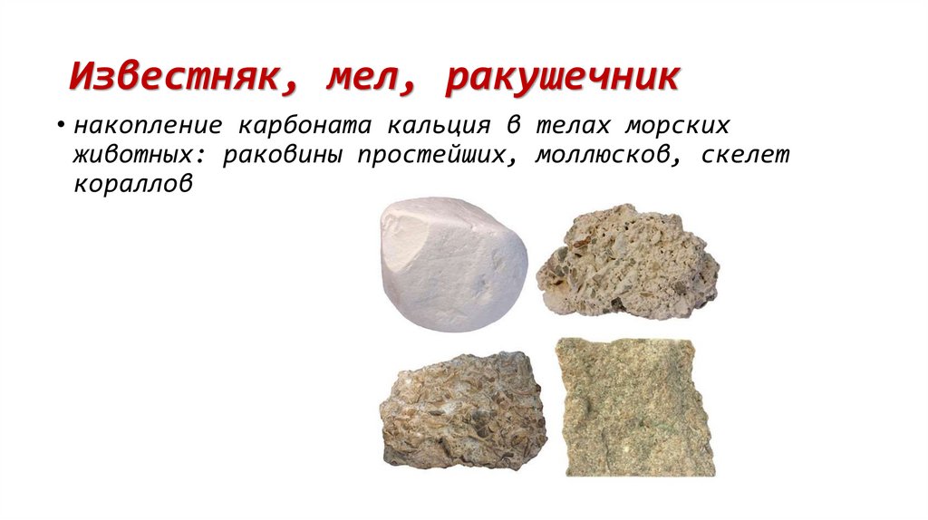 Известняк, мел, ракушечник• накопление карбоната кальция в телах морских