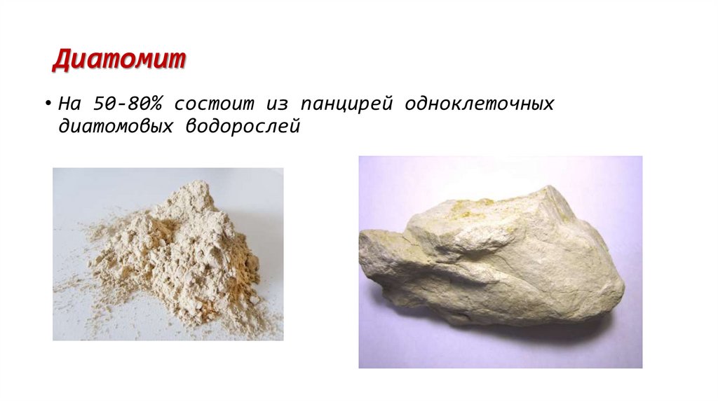 Диатомит• На 50-80% состоит из панцирей одноклеточных