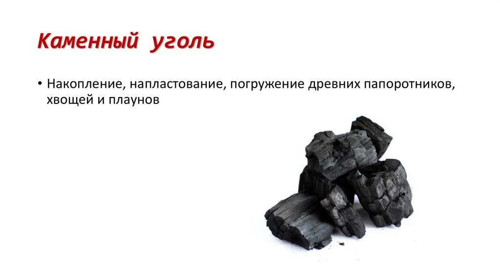 Каменный уголь• Накопление, напластование, погружение древних папоротников,