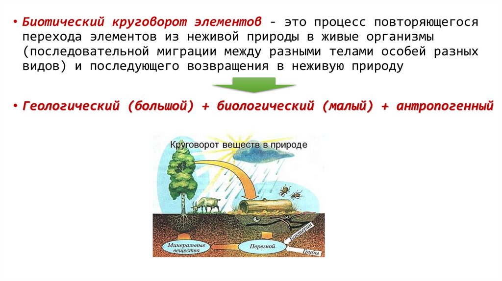 • Биотический круговорот элементов - это процесс повторяющегосяперехода элементов из неживой природы в живые организмы