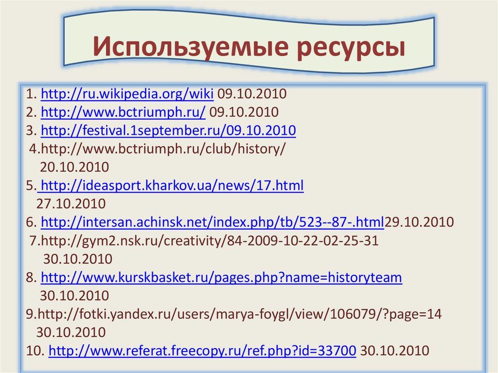 Используемые ресурсы1. http://ru.wikipedia.org/wiki 09.10.2010