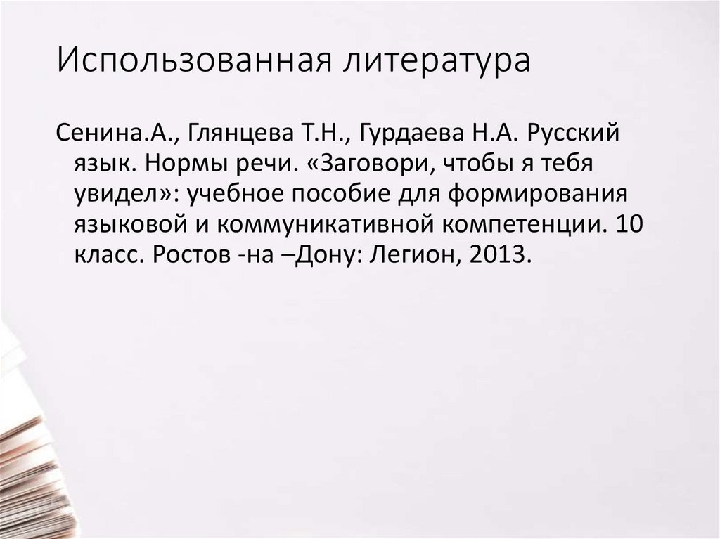 Использованная литератураСенина.А., Глянцева Т.Н., Гурдаева Н.А. Русский