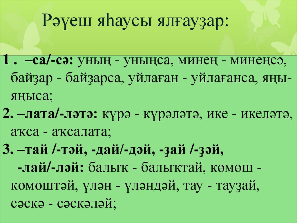 байҙар - байҙарса, уйлаған - уйлағанса, яңыяңыса;