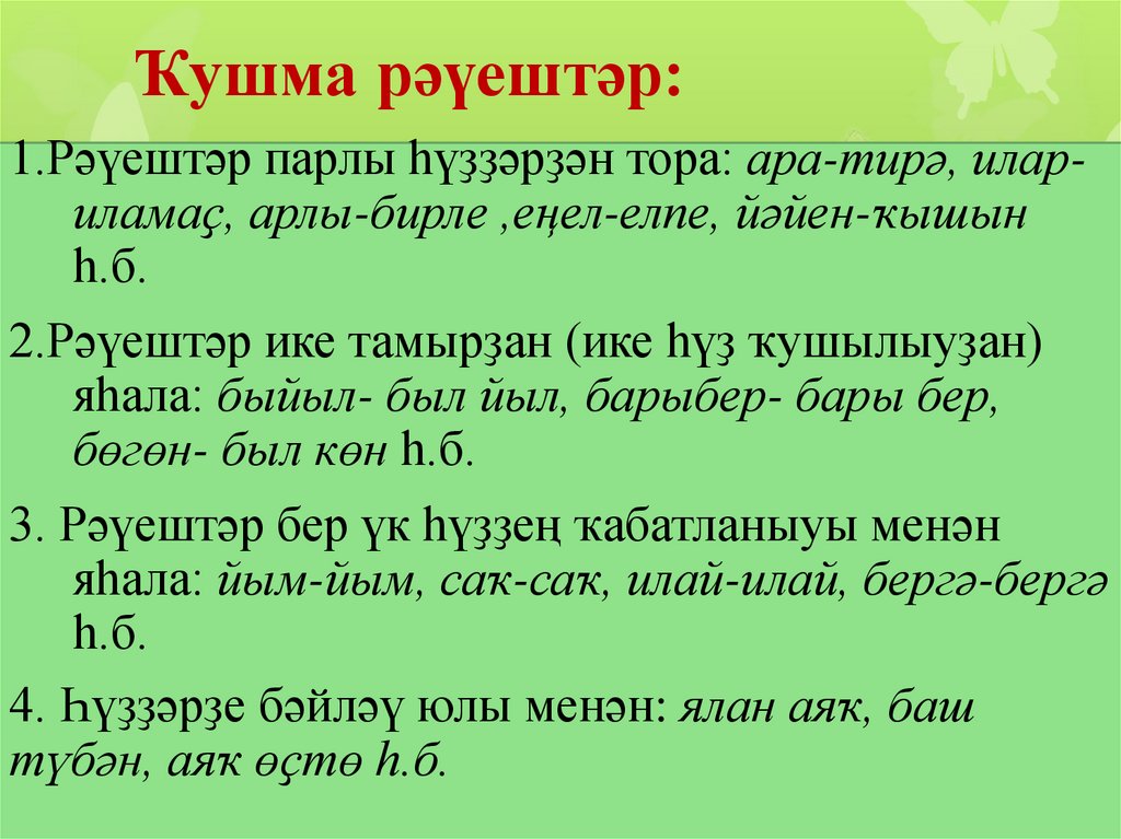 Ҡушма рәүештәр:1.Рәүештәр парлы һүҙҙәрҙән тора: ара-тирә, илариламаҫ, арлы-бирле ,еңел-елпе, йәйен-ҡышын