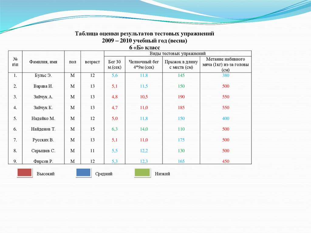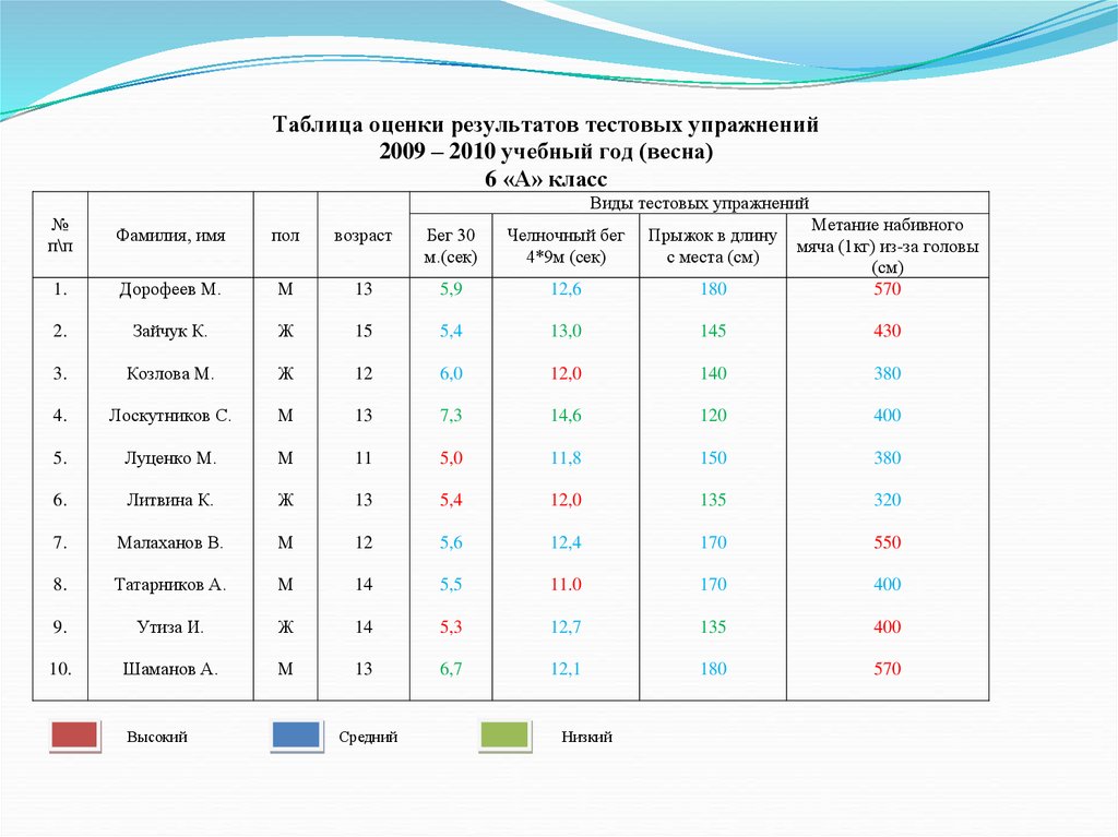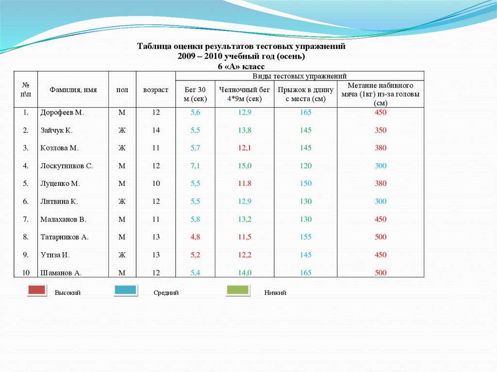 Таблица оценки результатов тестовых упражнений2009 – 2010 учебный год (весна)