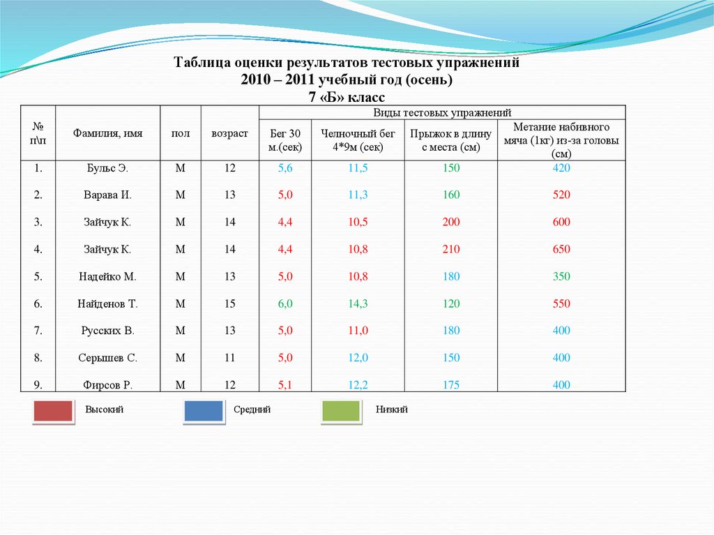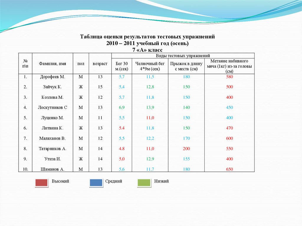 Таблица оценки результатов тестовых упражнений2010 – 2011 учебный год (осень)