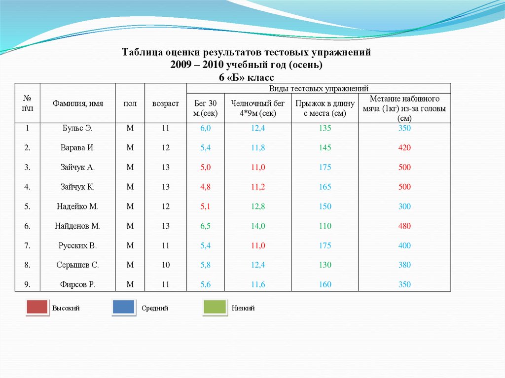 Таблица оценки результатов тестовых упражнений2009 – 2010 учебный год (осень)