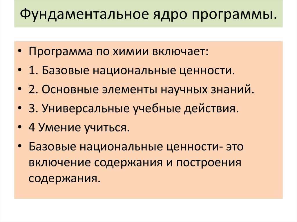 Фундаментальное ядро программы.Программа по химии включает:
