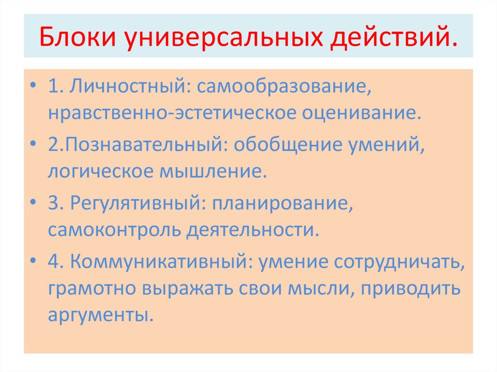 Блоки универсальных действий.• 1. Личностный: самообразование,