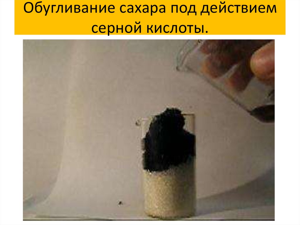 Обугливание сахара под действиемсерной кислоты.