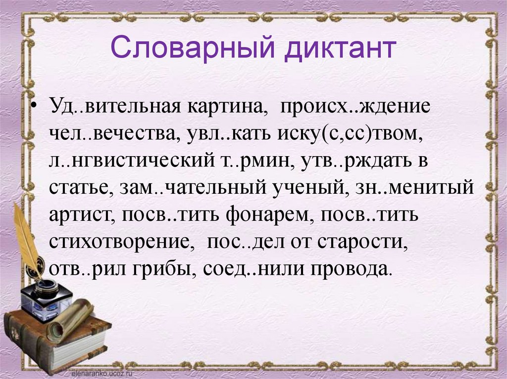 Словарный диктант• Уд..вительная картина, происх..ждение