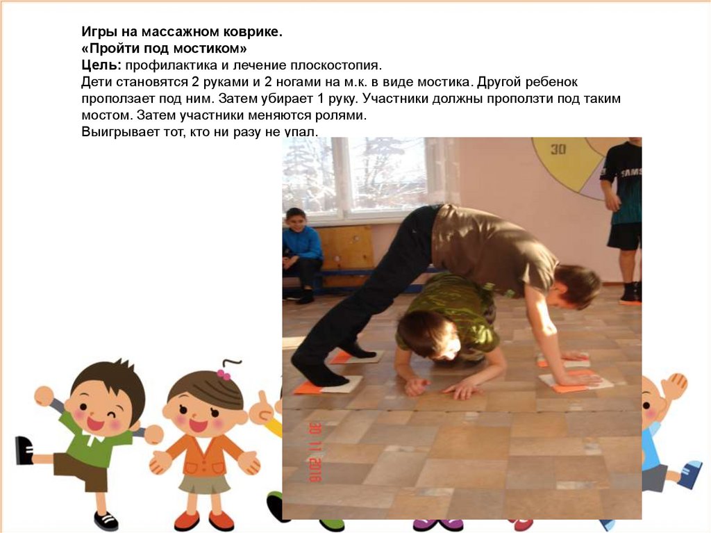 Дети становятся 2 руками и 2 ногами на м.к. в виде мостика. Другой ребенок