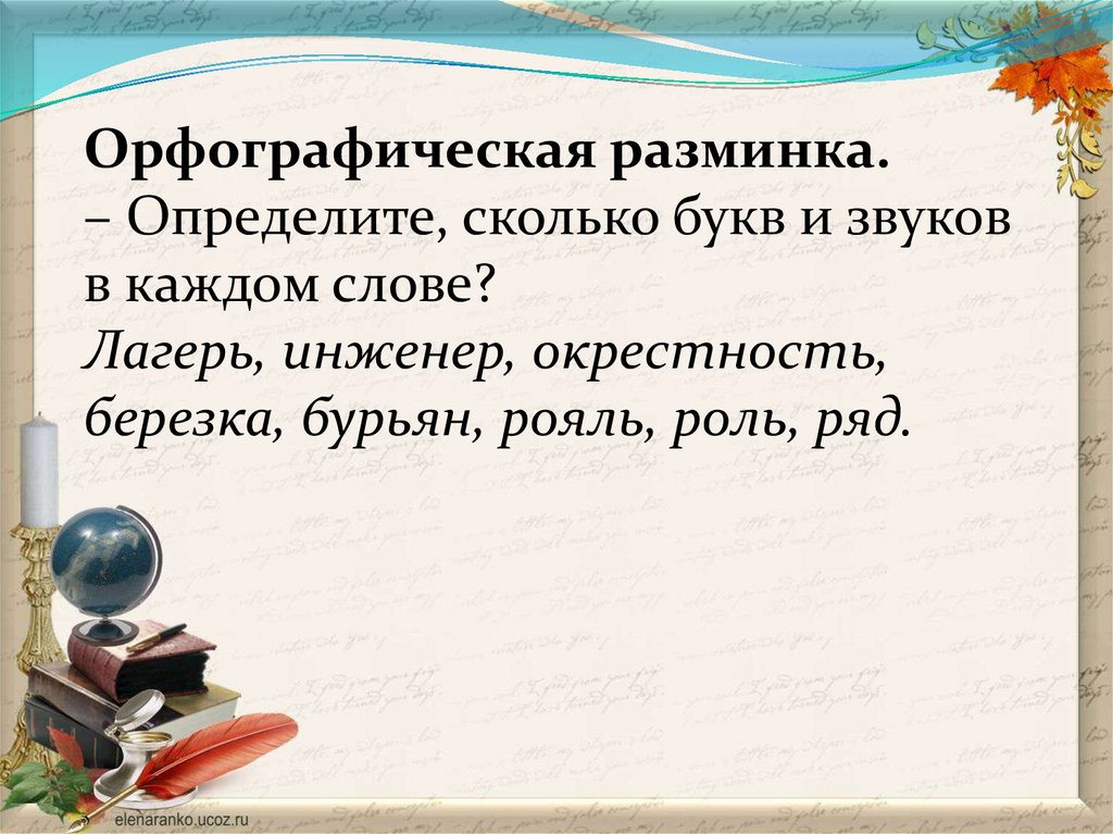 Орфографическая разминка.– Определите, сколько букв и звуков