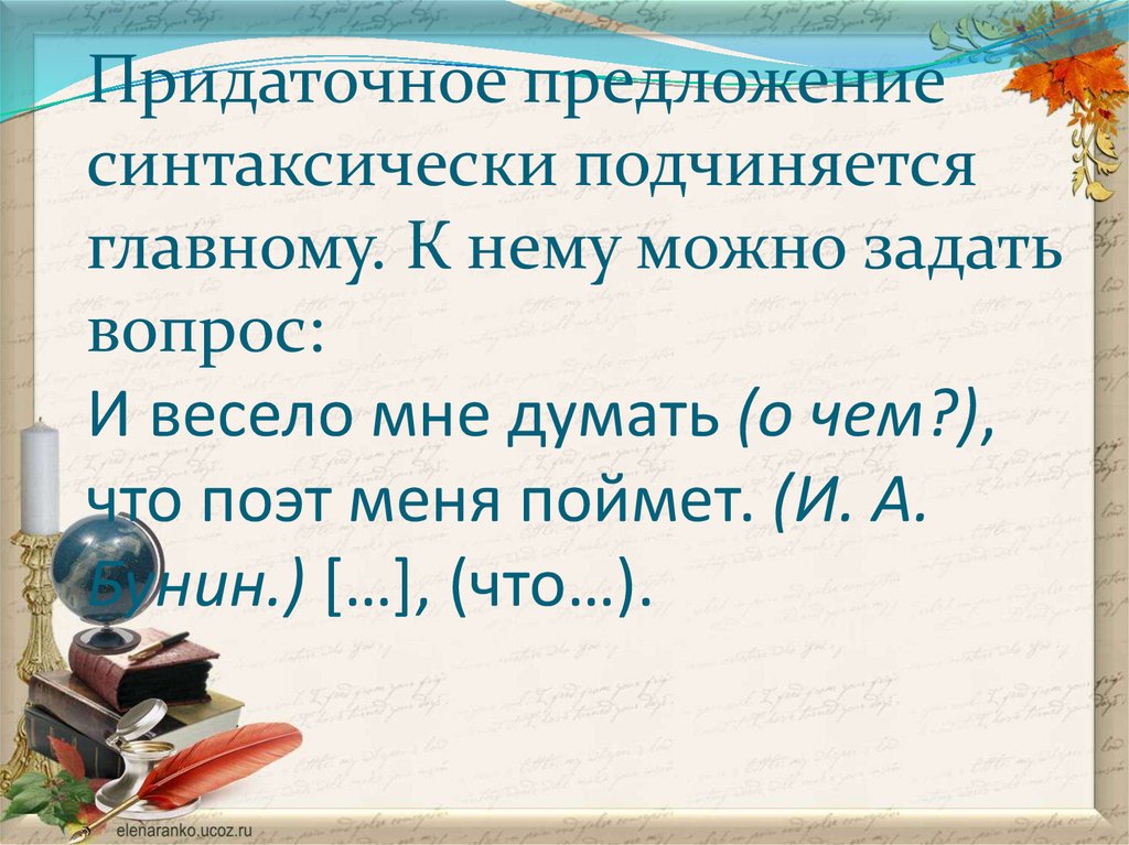 Сложноподчиненное предложение состоит изодной независимой части (главное предложение)