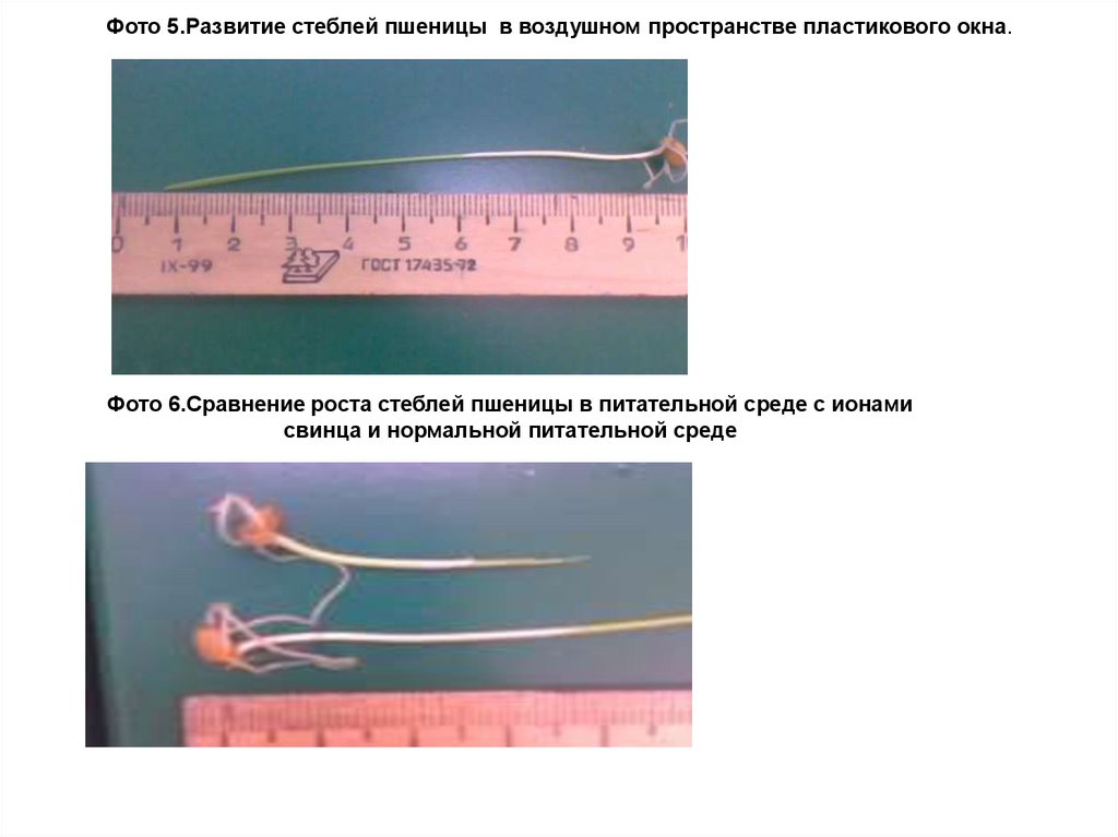 Фото 5.Развитие стеблей пшеницы в воздушном пространстве пластикового окна.Фото 6.Сравнение роста стеблей пшеницы в питательной среде с ионами