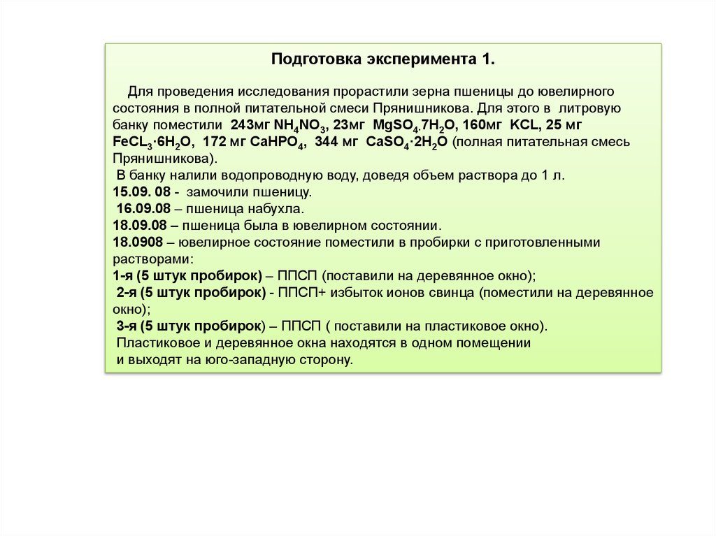 Подготовка эксперимента 1.Для проведения исследования прорастили зерна пшеницы до ювелирного