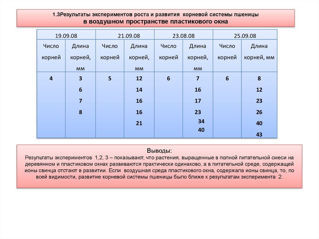 1.3Результаты экспериментов роста и развития корневой системы пшеницыв воздушном пространстве пластикового окна