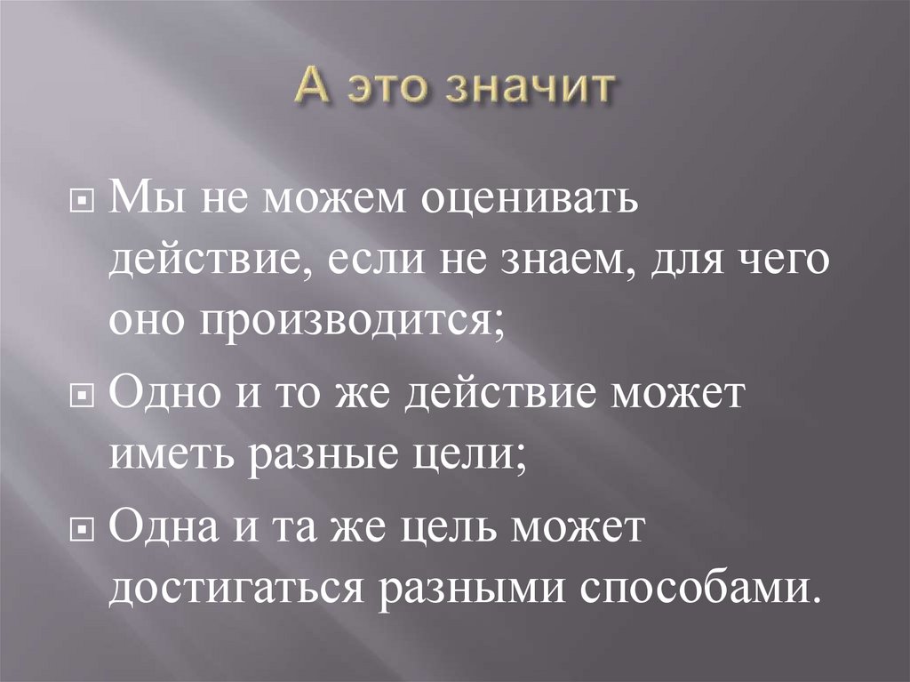 Мы не можем оценивать действие, если не знаем, длячего оно производится;
