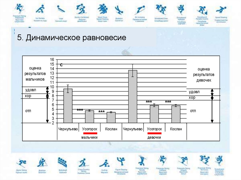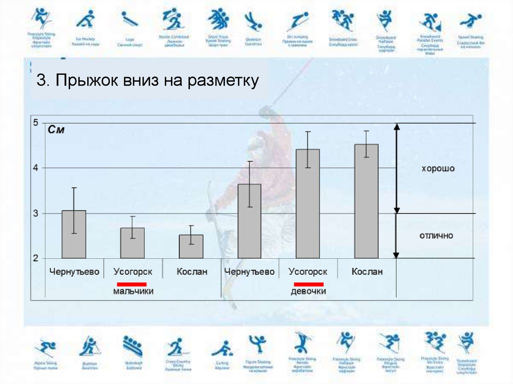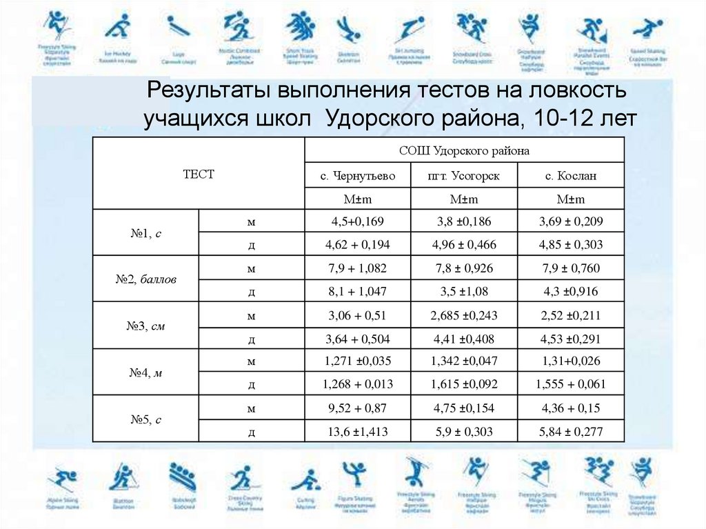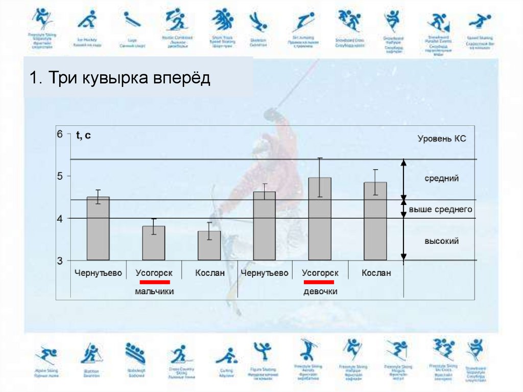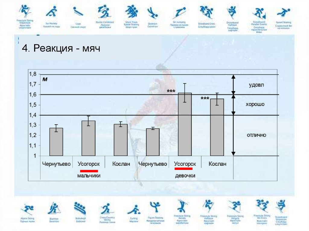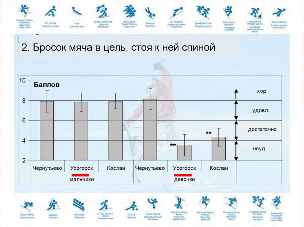 31. ● Результаты координационных способностей мальчиков школы с.Чернутьево оценены как «выше среднего», а СОШ гпУсогорск и с.Кослан