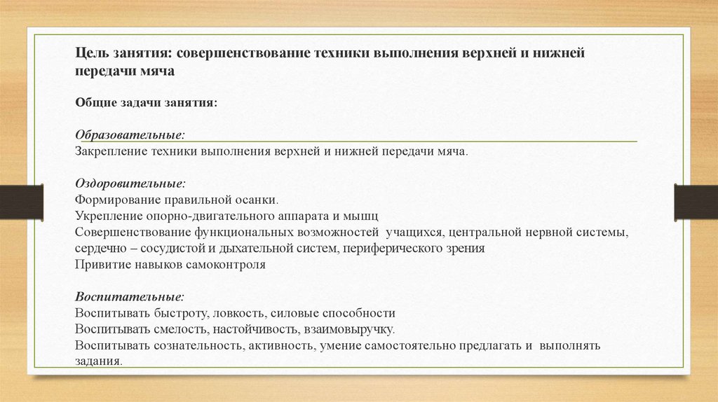 Цель занятия: совершенствование техники выполнения верхней и нижнейпередачи мяча