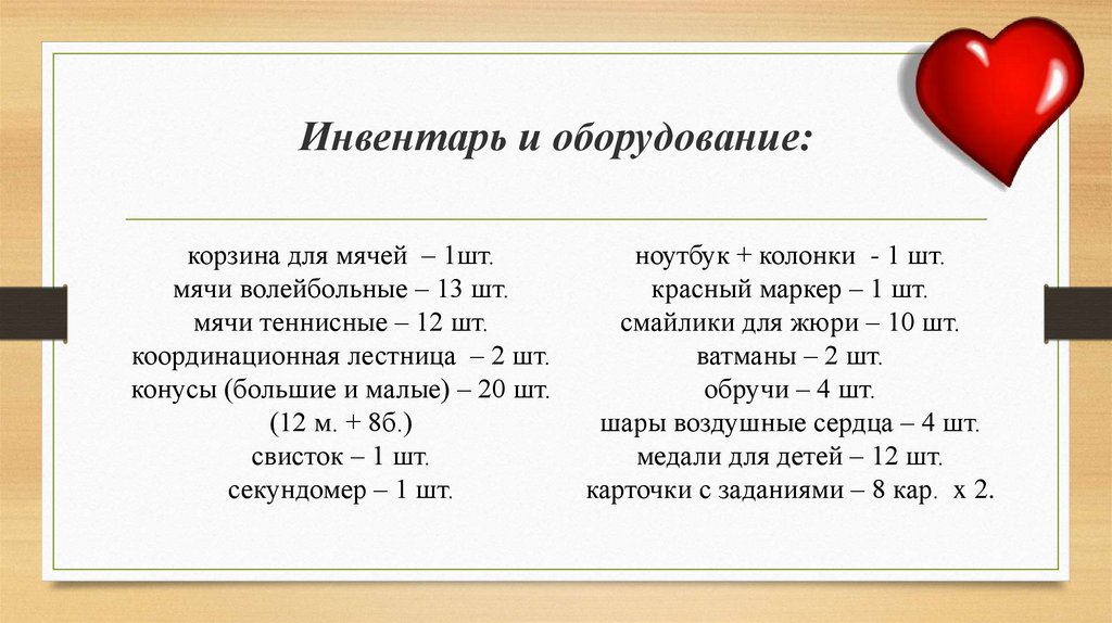 Инвентарь и оборудование:корзина для мячей – 1шт.