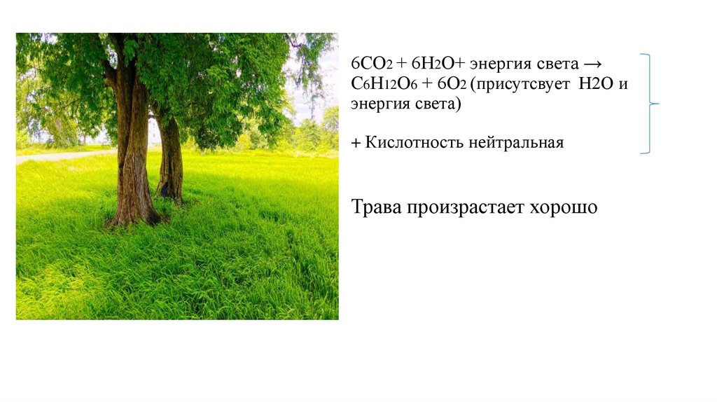 6СО2 + 6Н2О+ энергия света →С6Н12О6 + 6О2 (присутсвует Н2О и