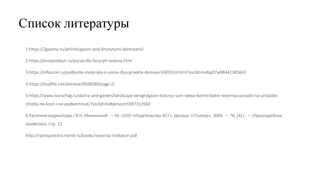 Список литературы1.https://2gazona.ru/articles/gazon-pod-khvoynymi-derevyami/