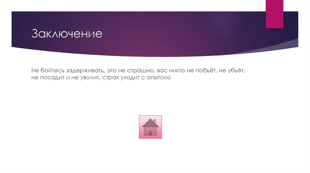 ЗаключениеНе бойтесь задерживать, это не страшно, вас никто не побьёт, не убьёт,