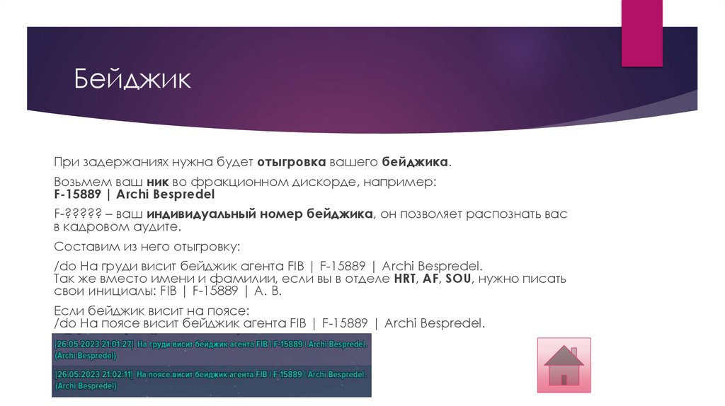 БейджикПри задержаниях нужна будет отыгровка вашего бейджика.