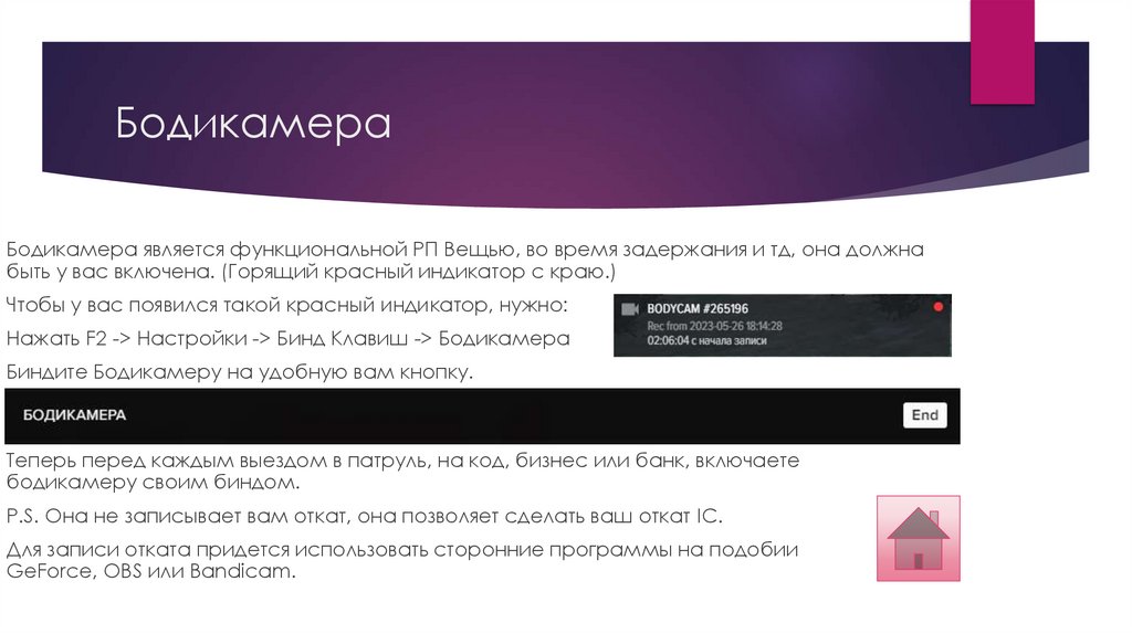 БодикамераБодикамера является функциональной РП Вещью, во время задержания и тд, она должна