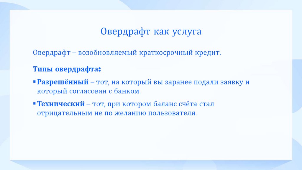 Овердрафт как услугаОвердрафт – возобновляемый краткосрочный кредит.