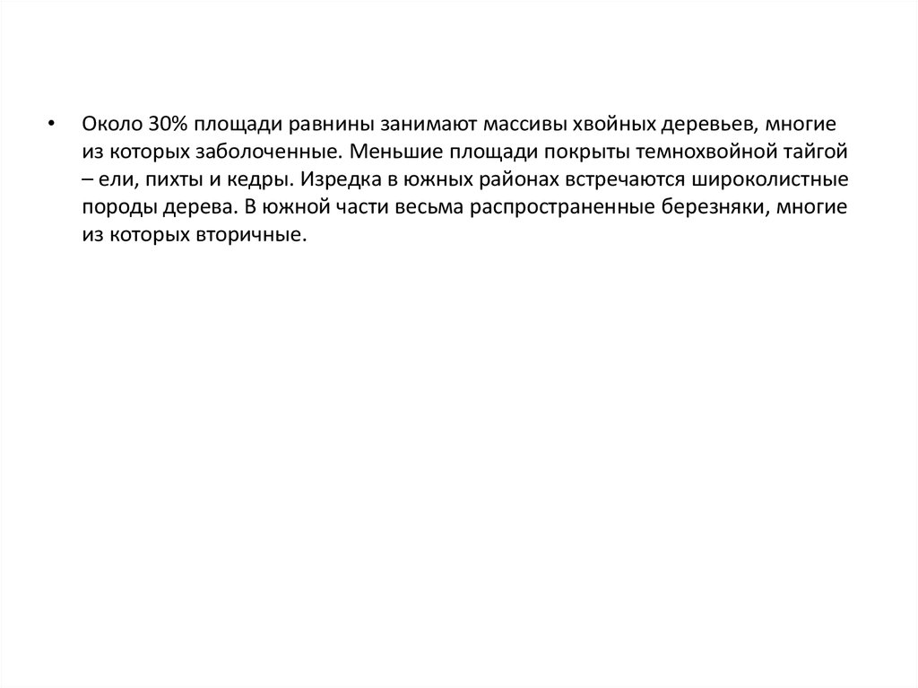 Около 30% площади равнины занимают массивы хвойных деревьев, многие