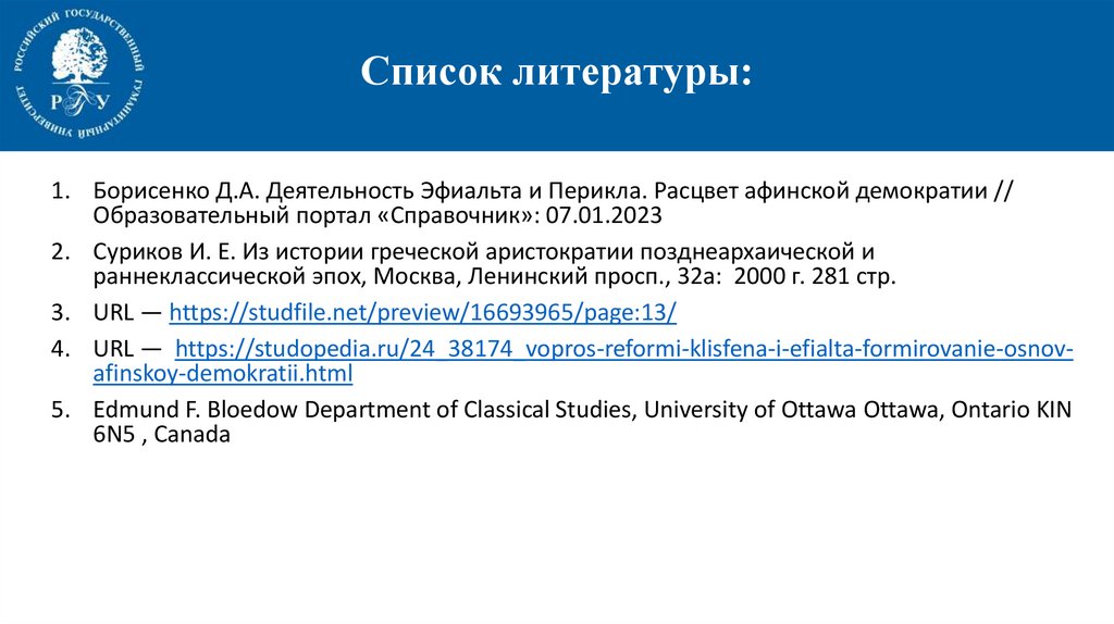 Список литературы:1. Борисенко Д.А. Деятельность Эфиальта и Перикла. Расцвет афинской демократии //