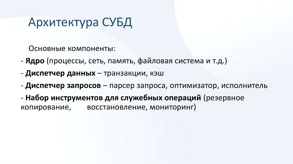- Диспетчер запросов – парсер запроса, оптимизатор, исполнитель