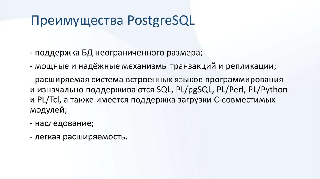 Преимущества PostgreSQL- поддержка БД неограниченного размера;