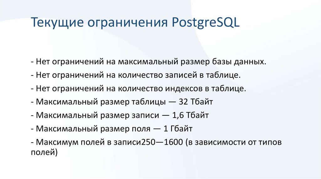 Текущие ограничения PostgreSQL- Нет ограничений на максимальный размер базы данных.