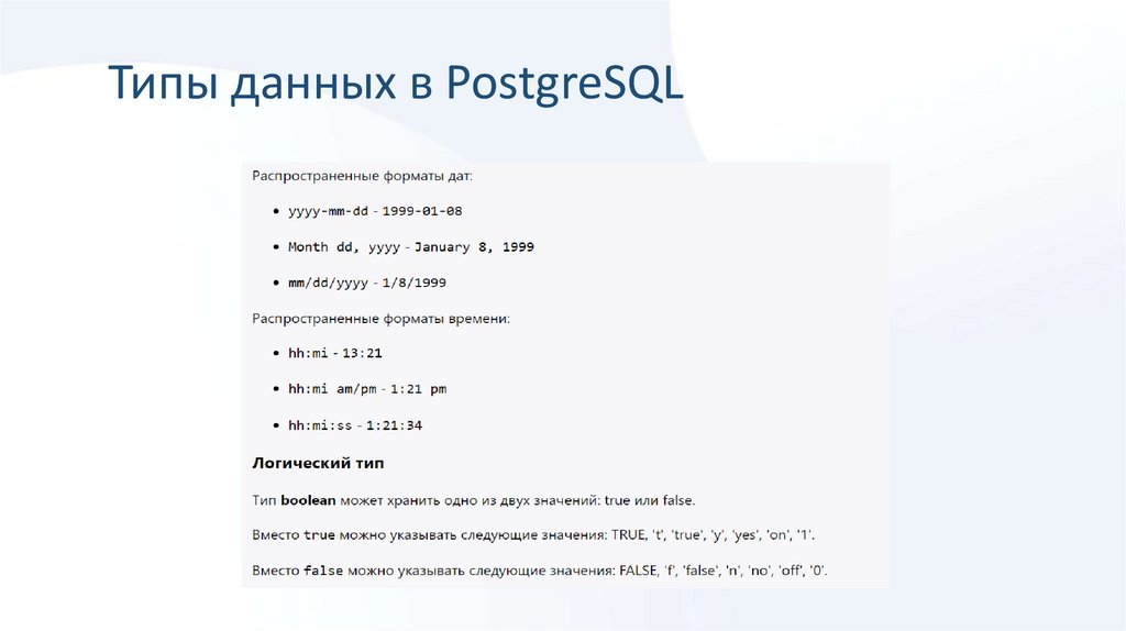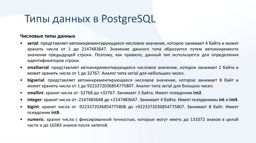 • integer: хранит числа от -2147483648 до +2147483647. Занимает 4 байта. Имеет псевдонимы int и int4.