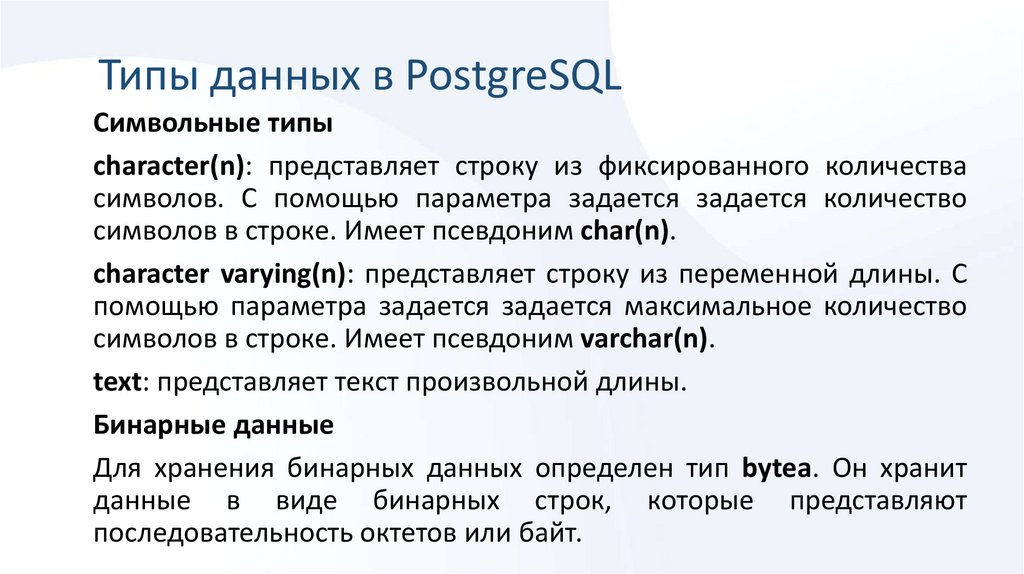 Для хранения бинарных данных определен тип bytea. Он хранит