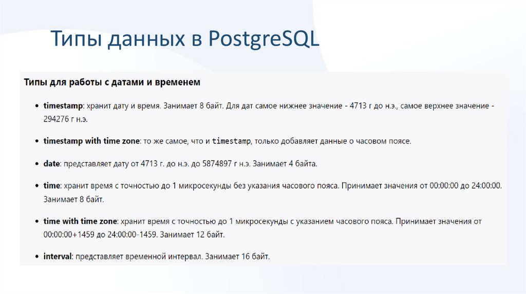 • bigint: хранит числа от -9223372036854775808 до +9223372036854775807. Занимает 8 байт. Имеет