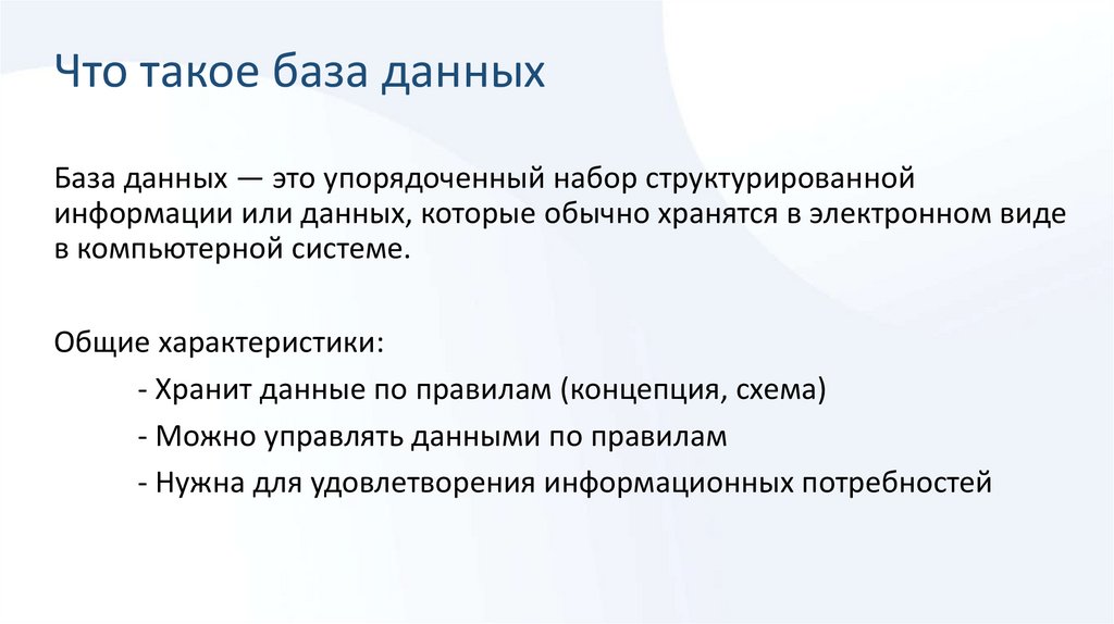 Что такое база данныхБаза данных — это упорядоченный набор структурированной