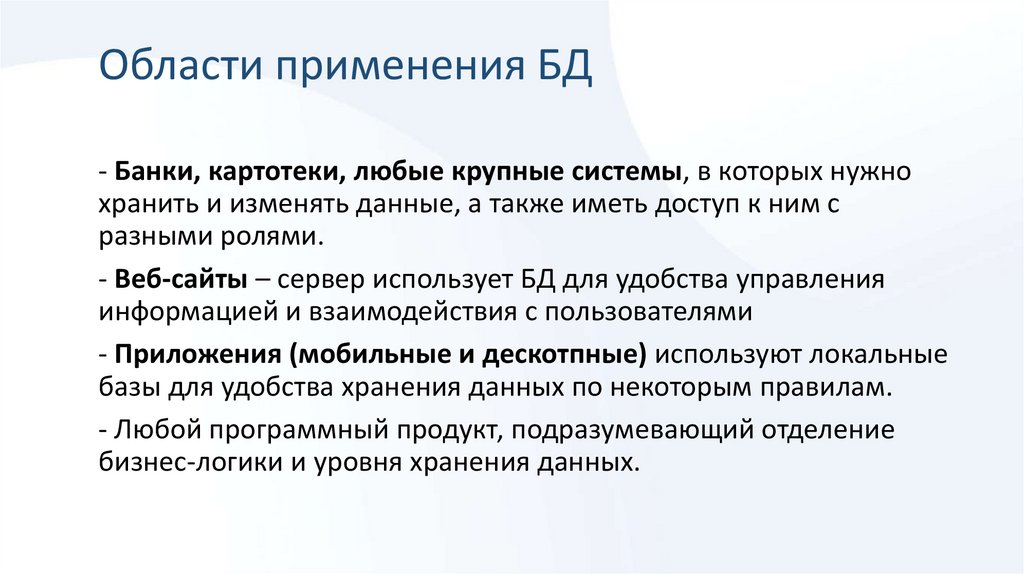 Области применения БД- Банки, картотеки, любые крупные системы, в которых нужно