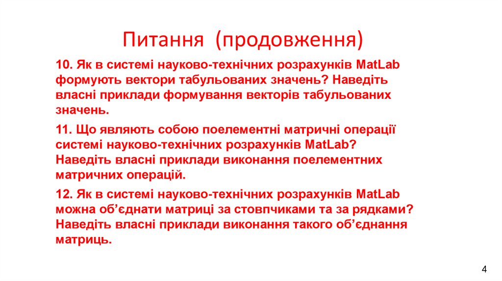 Питання (продовження)10. Як в системі науково-технічних розрахунків MatLab