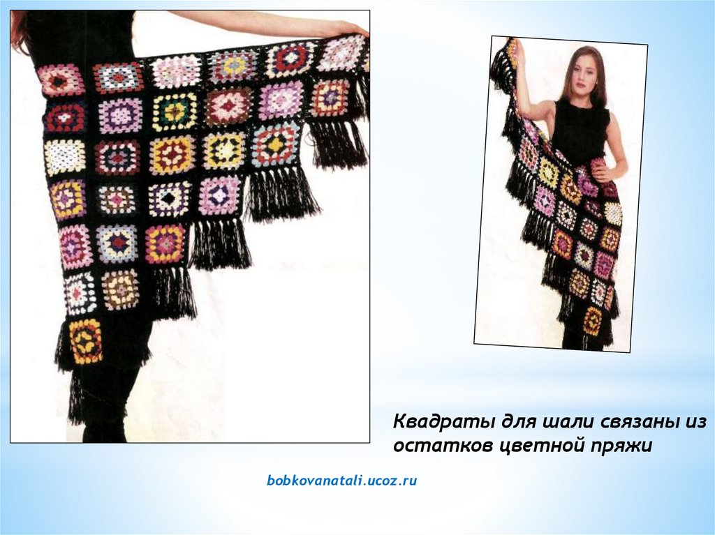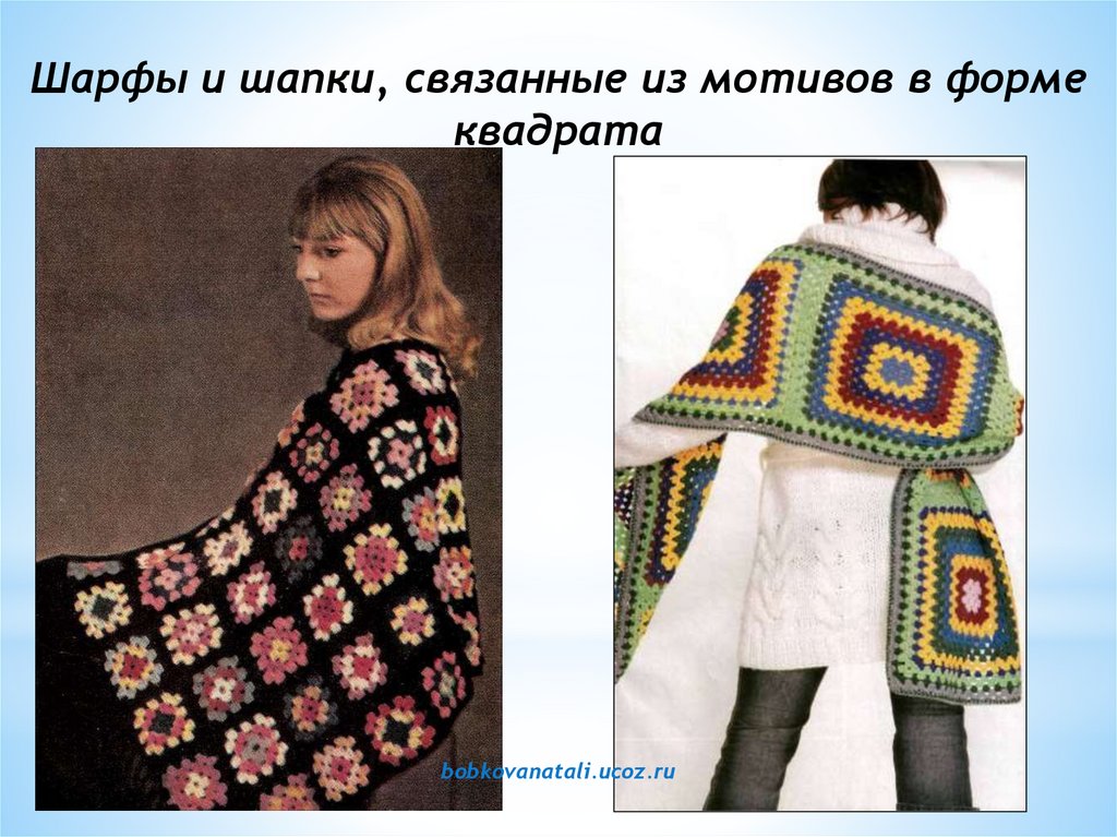 Шарфы и шапки, связанные из мотивов в формеквадрата
