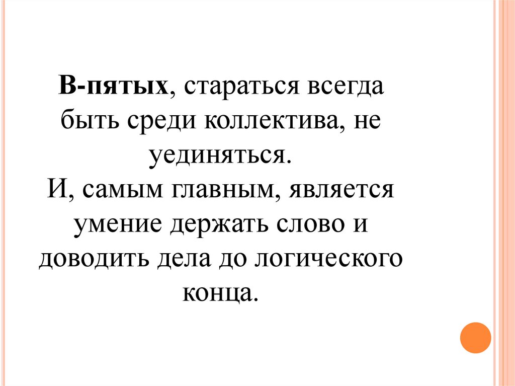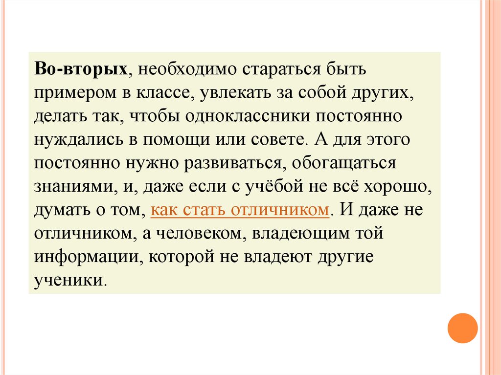 Во-вторых, необходимо стараться бытьпримером в классе, увлекать за собой других,