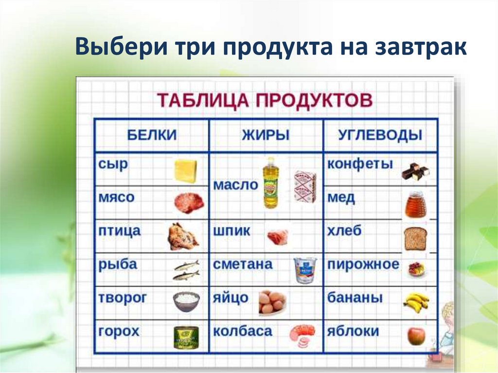Выбери три продукта на завтрак9.