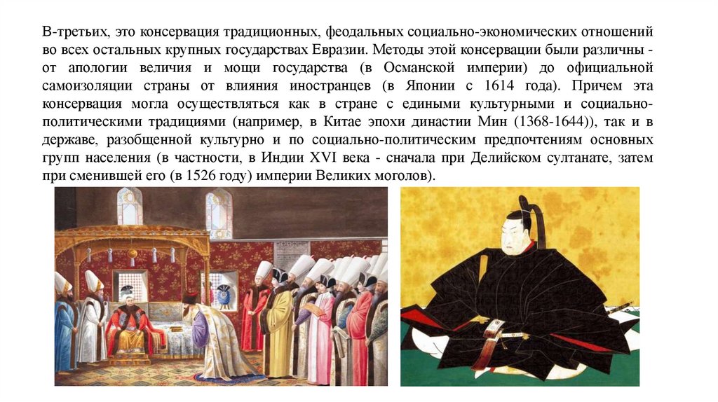 В-третьих, это консервация традиционных, феодальных социально-экономических отношенийво всех остальных крупных государствах Евразии. Методы этой консервации были различны от апологии величия и мощи государства (в Османской империи) до официальной
