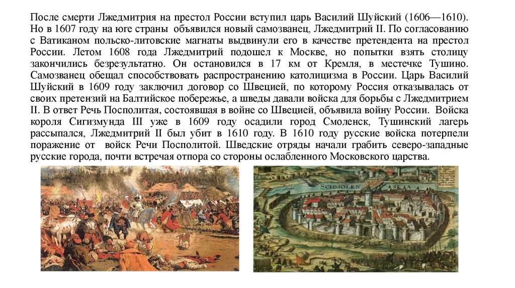 рассыпался, Лжедмитрий II был убит в 1610 году. В 1610 году русские войска потерпели