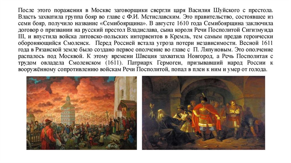 После этого поражения в Москве заговорщики свергли царя Василия Шуйского с престола.Власть захватила группа бояр во главе с Ф.И. Мстиславским. Это правительство, состоявшее из