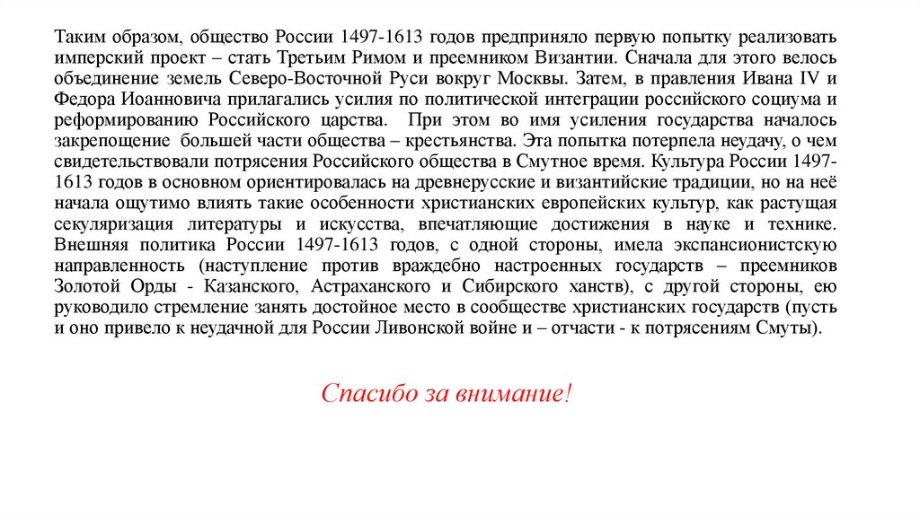 Таким образом, общество России 1497-1613 годов предприняло первую попытку реализоватьимперский проект – стать Третьим Римом и преемником Византии. Сначала для этого велось