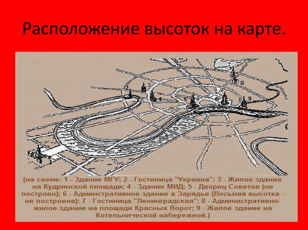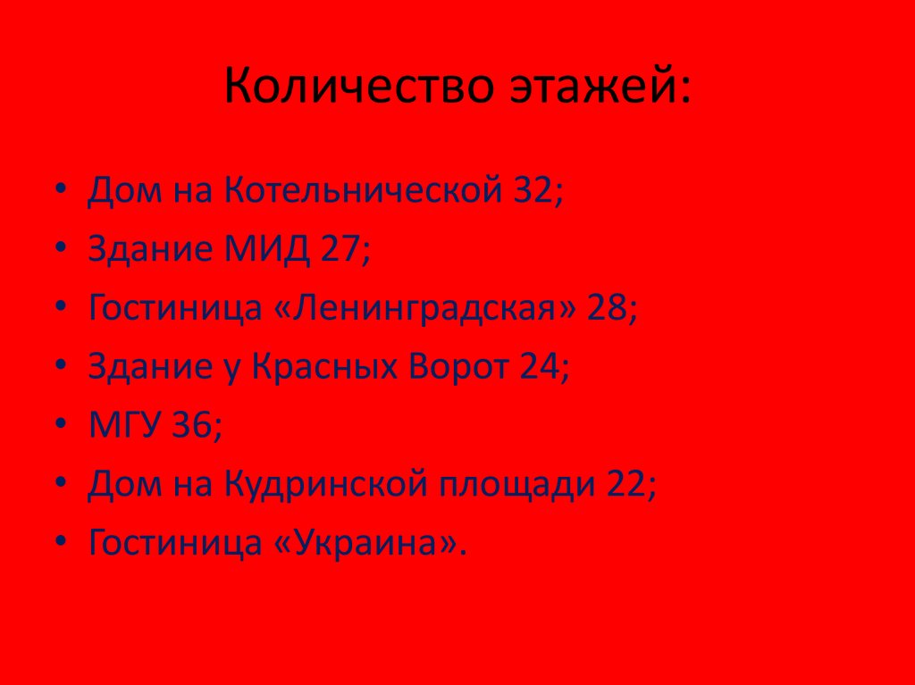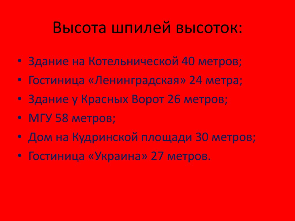 Высота шпилей высоток:Здание на Котельнической 40 метров;